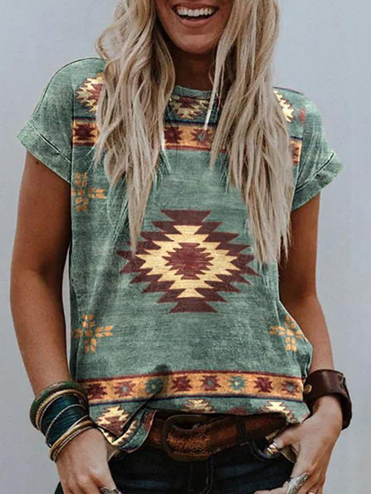Wisherryy Ethnic Print Short Sleeve T-Shirt