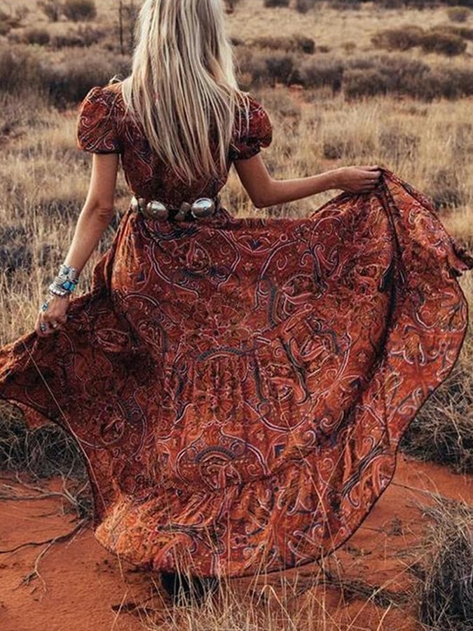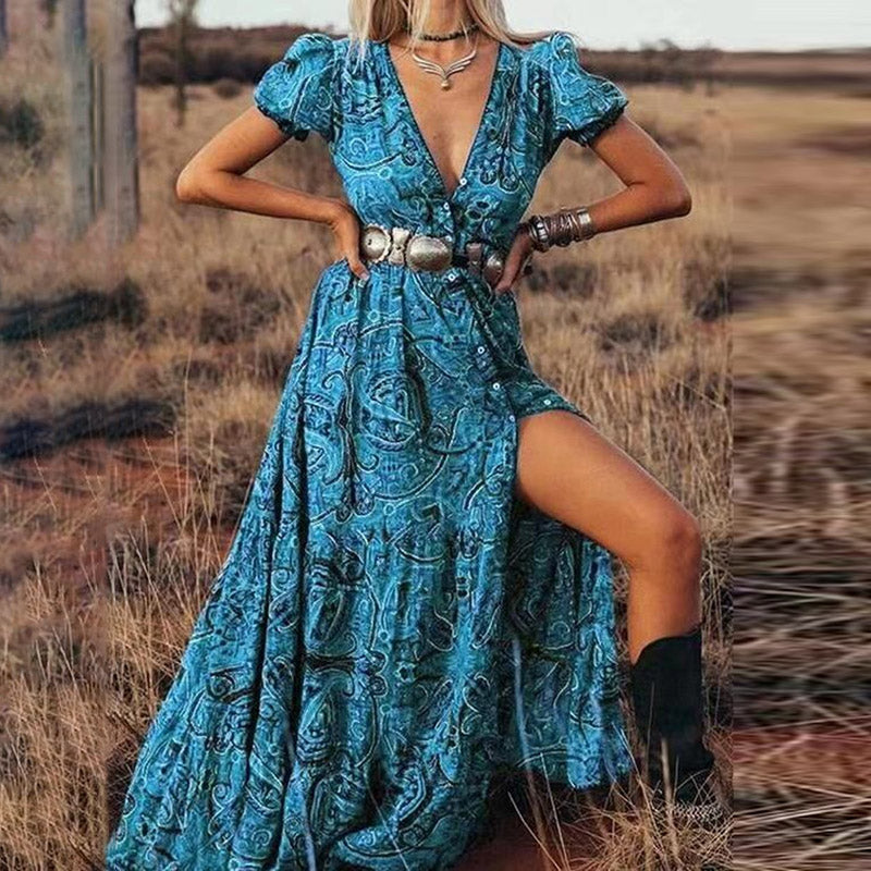 Wisherryy Printed V-Neck Short Sleeve Bohemian Resort Maxi Dress