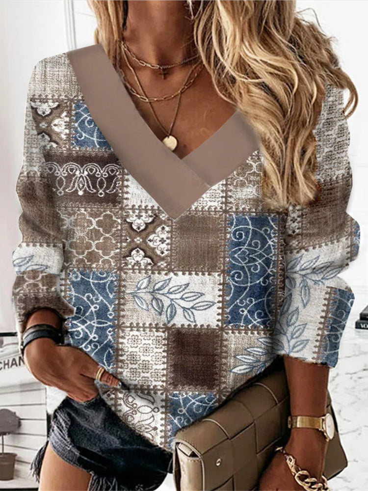 Vintage Geometric Print V-Neck Long Sleeve Sweatshirt