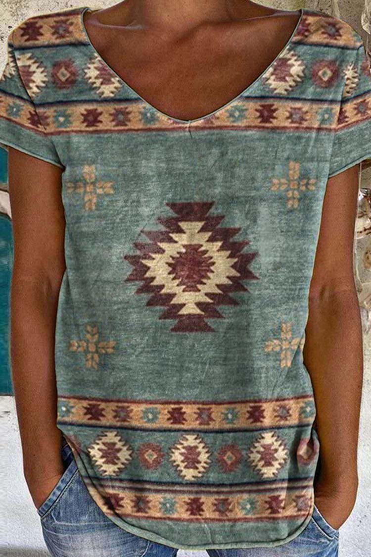 Wisherryy Western V Neck Print Short Sleeve T-Shirt